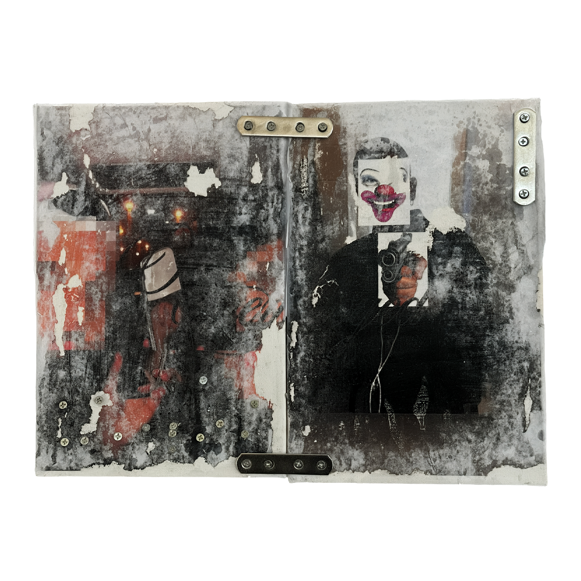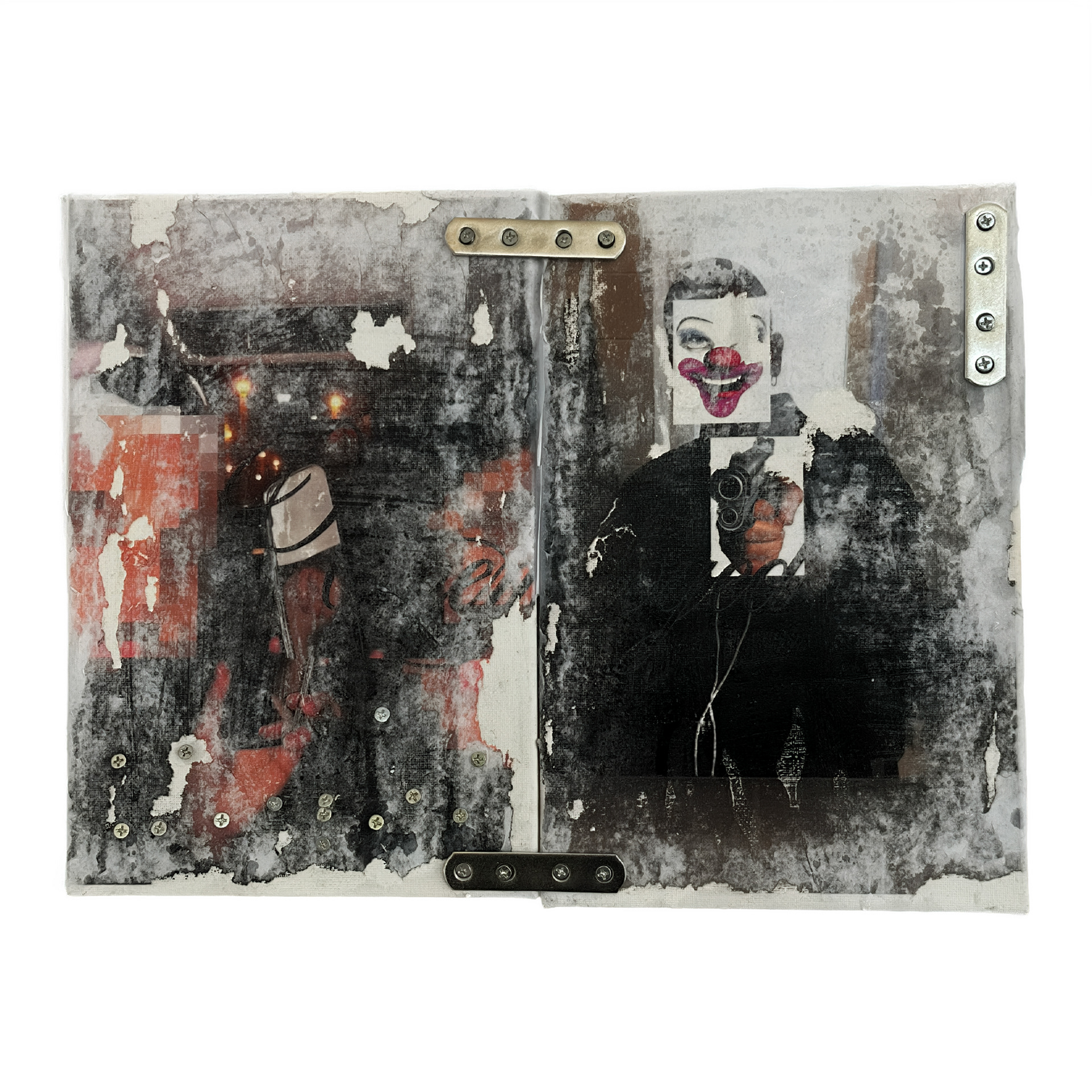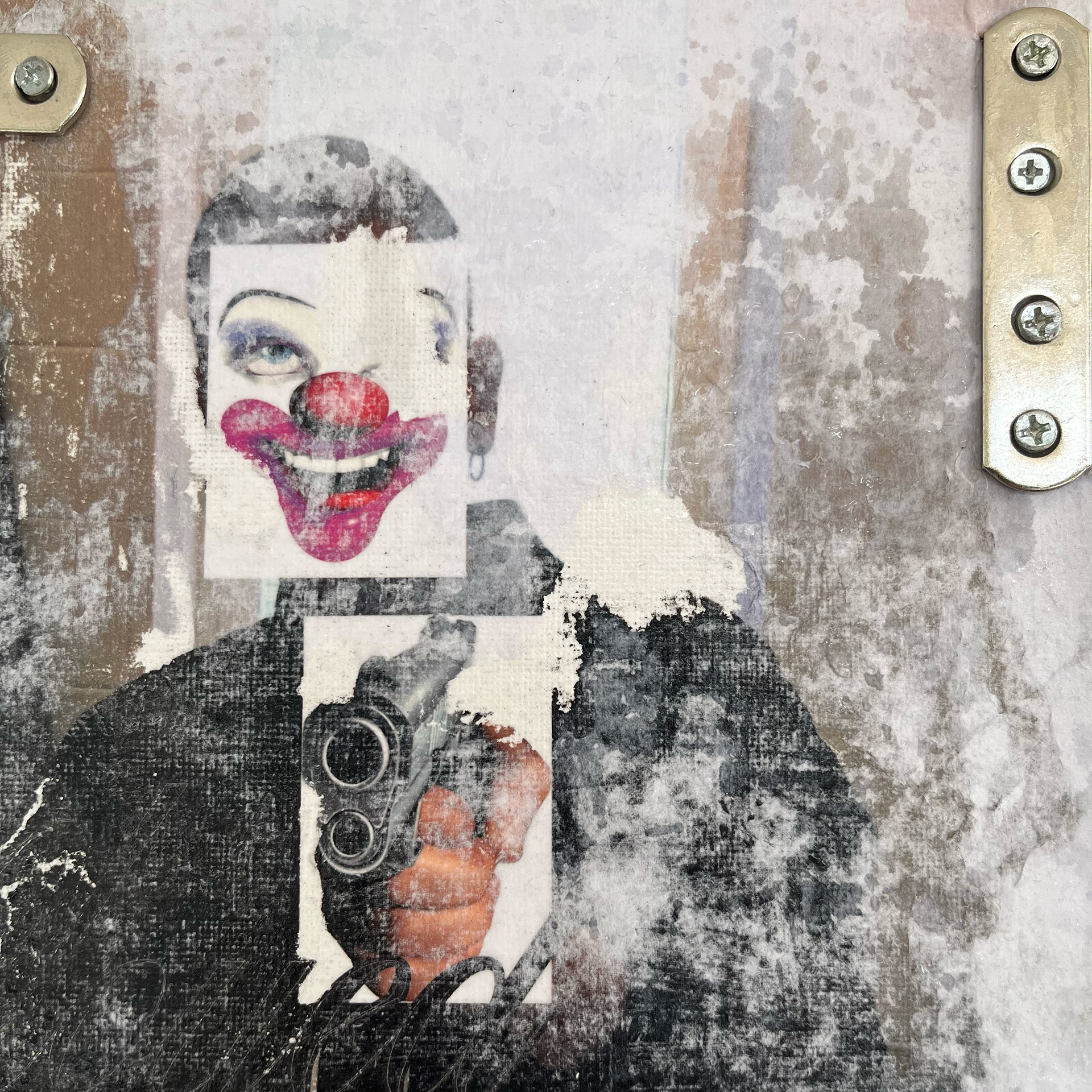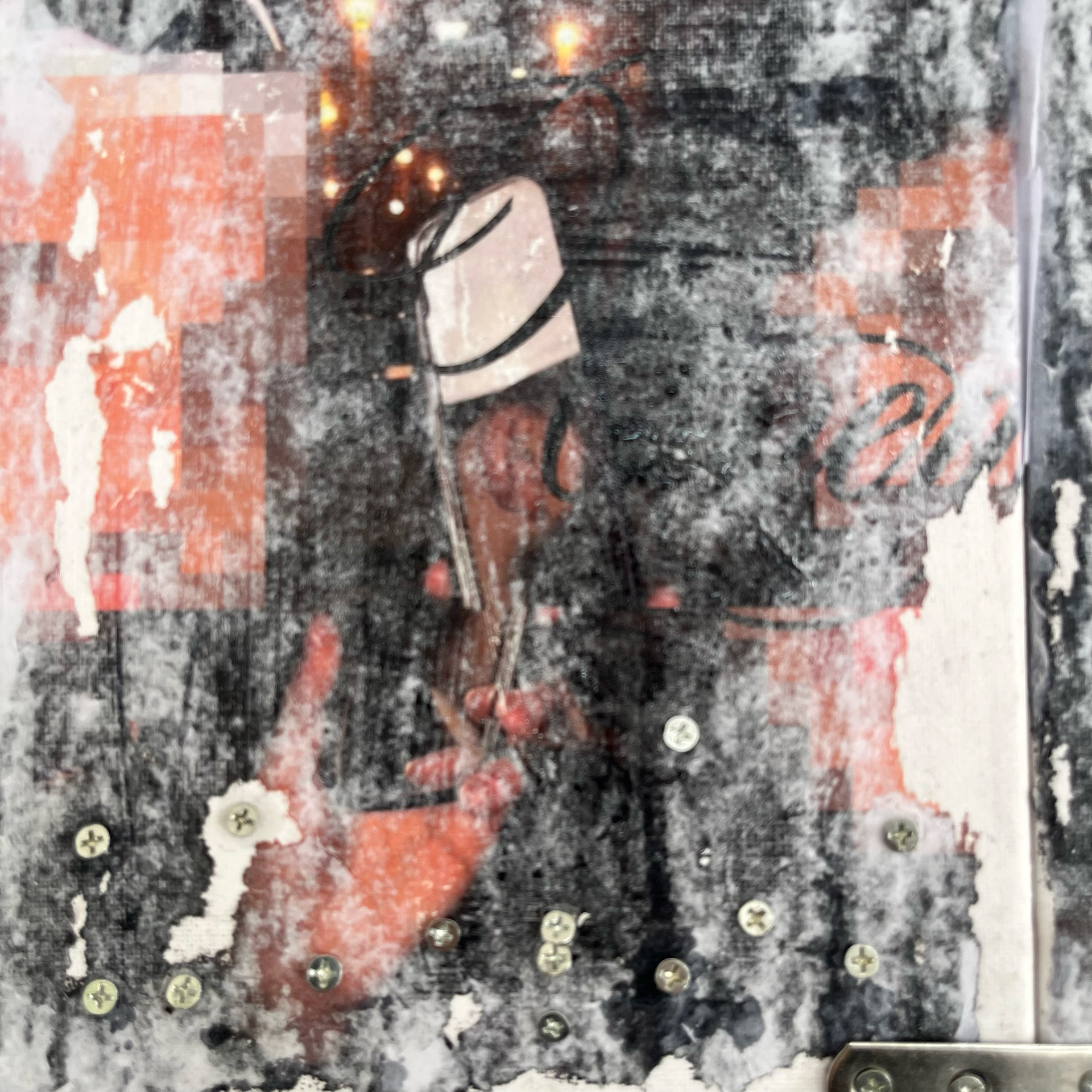 Acrylic, ink, screws, metal hardwares, inkjet prints and tar gel on canvas